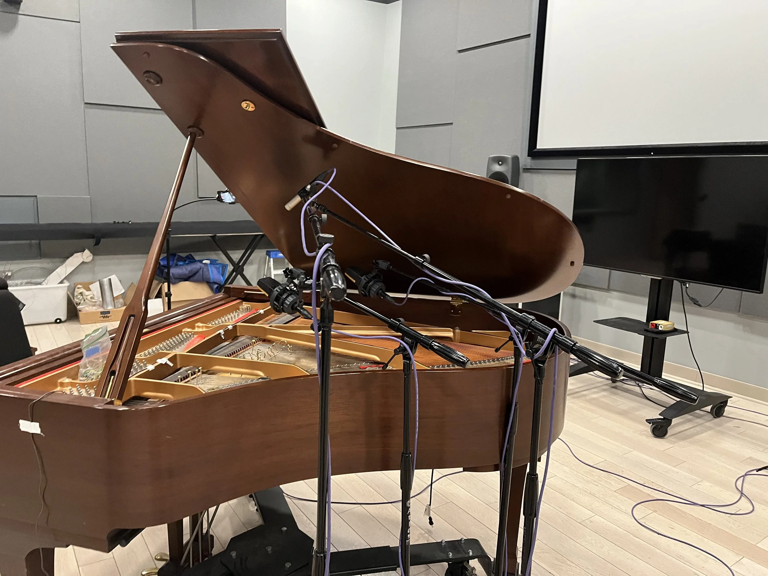 Prepared piano recorded through a AWS SSL 24/48 Console. A/B stereo pair over the strings, two lavalier mics taped to the piano bridge, and an X/Y pair near the piano lid parallel compressed using an LA-610.